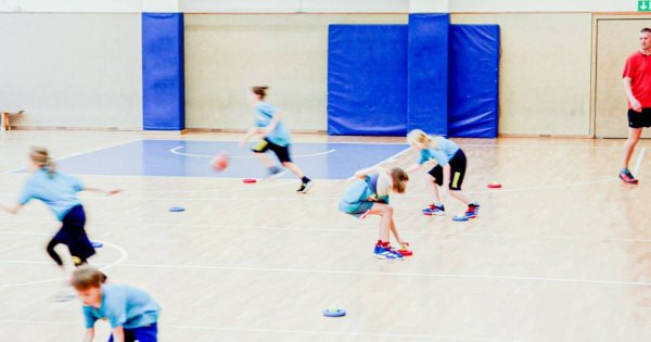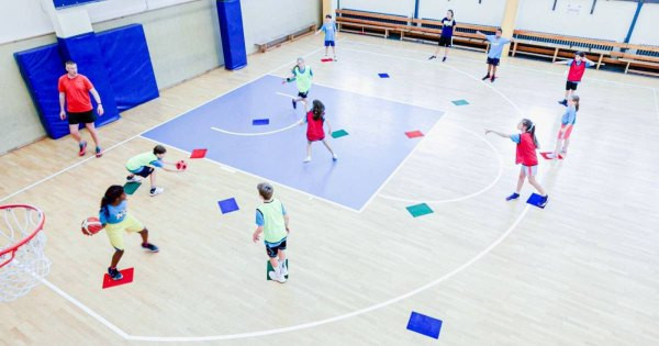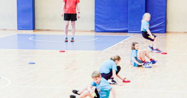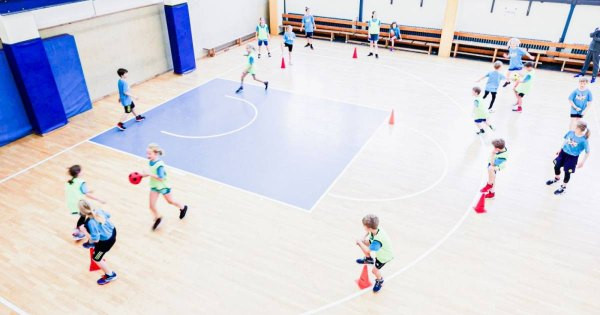 Ball ablegen ist ein Laufspiel, bei dem die Kinder in Staffeln gegeneinander antreten und Tennisbälle zu verschiedenen Ringen bringen müssen. Nicht nur die Schnelligkeit entscheidet, sondern auch die richtige Strategie. In dieser Variante müssen die Kinder zusätzlich einen Ball am Fuß führen.