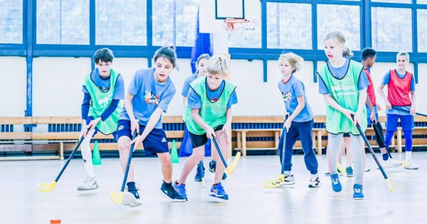 Das menschliche Tor ist ein Ballspiel für Grundschulkinder. Hier geht es um die geschickte Ballführung mit Schläger sowie darum, Lösungen im 1 gegen 1 zu finden und sich klug dem Ziel anzunähern. Durch den Mitspieler als menschliches Tor und den Wechsel nach einem Torerfolg ist zudem ein schnelles Umschaltspiel gefordert.