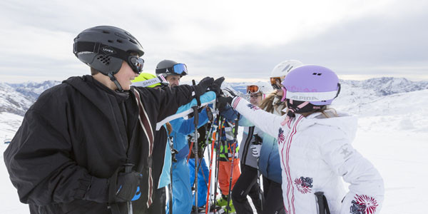Hand-in-Hand solle nebeneinander Kurven gefahren werden. Bei Snowboardern funktioniert das auch, indem beide in der vorderen Hand eine Kipp- oder Netzstange halten. Die SuS erlernen, ihre Umgebung im Blick zu behalten, Grenzen zu überwinden und sich verfügbar zu machen.