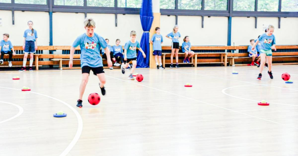 Ball ablegen ist ein Laufspiel, bei dem die Kinder in Staffeln gegeneinander antreten und Tennisbälle zu verschiedenen Ringen bringen müssen. Nicht nur die Schnelligkeit entscheidet, sondern auch die richtige Strategie. In dieser Variante müssen die Kinder zusätzlich einen Ball am Fuß führen.