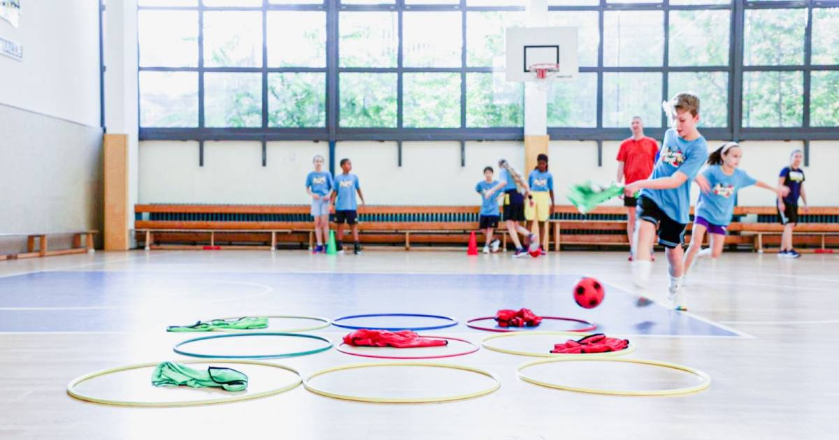 Drei gewinnt (oder Tic Tac Toe) ist ein Spieleklassiker, der nicht nur heimlich auf der Schulbank für Spaß sorgt. Als Laufvariante bringt das Spiel neben dem Geist auch die Körper der Kinder ins Schwitzen. Wer schafft es zuerst, mit seinen Leibchen eine Dreierreihe zu bilden? In dieser Variante führen die Kinder zusätzich einen Ball am Fuß.