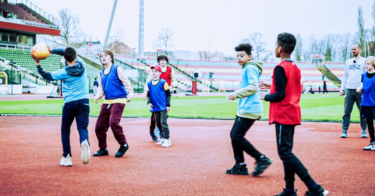 „Parteiball“ ist ein Passspiel für Grundschulkinder, bei dem zwei Teams gegen das dritte Team spielen und versuchen sich so oft wie möglich den Ball zu passen.