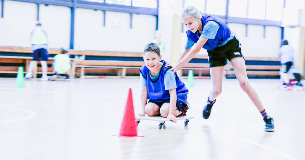 6-Tage-Rennen ist ein klassisches Laufspiel, bei dem die Kinder in Staffeln gegeneinander antreten. Wer dreht seine Runden am schnellsten und holt die gegnerische Staffel ein? In dieser Variante kniet ein Mitglied der Staffel auf einem Rollbrett und wird von einem anderen Mitglied angeschoben.
