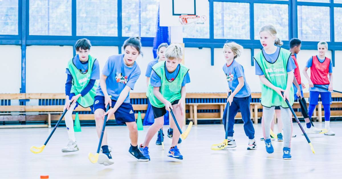 - Drei Teams einteilen, mit Leibchen markieren. Jedes Kind erhält einen Hockeyschläger